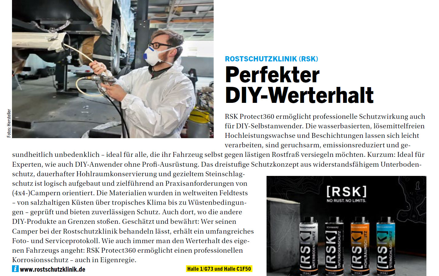 Ralf Rößler: „Wir sind happy. Große Anerkennung für die Rostschutzklinik. Auf der diesjährigen CMT wurden wir in der Kategorie Sicherheit, Nachhaltigkeit und Umwelt mit dem European Innovation Award ausgezeichnet. Erstmals in Europa würdigt die Jury damit ein fahrzeugbezogenes Korrosionsschutz-System, das Sicherheit, Nachhaltigkeit und Umweltwirkung nicht isoliert betrachtet, sondern konsequent zu einem ganzheitlichen, funktionalen Gesamtkonzept vereint, statt als isolierte Einzellösung.